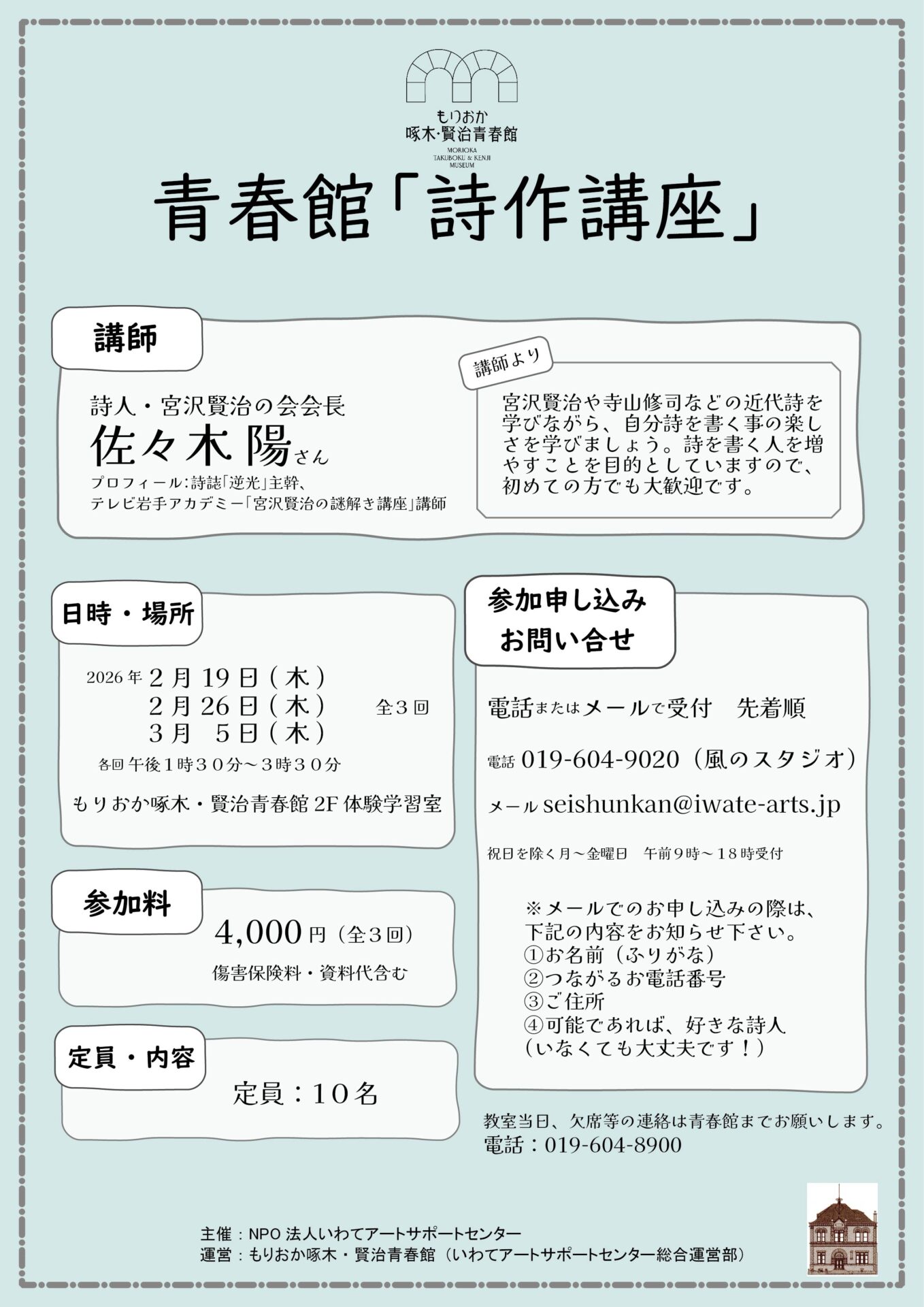 Mail: seishunkan@iwate-arts.jp ※メールでのお申し込みの際、①お名前(ふりがな)②つながるお電話番号 ③ご住所 ④可能であれば好きな詩人(いなくても大丈夫です!)をご記入ください。